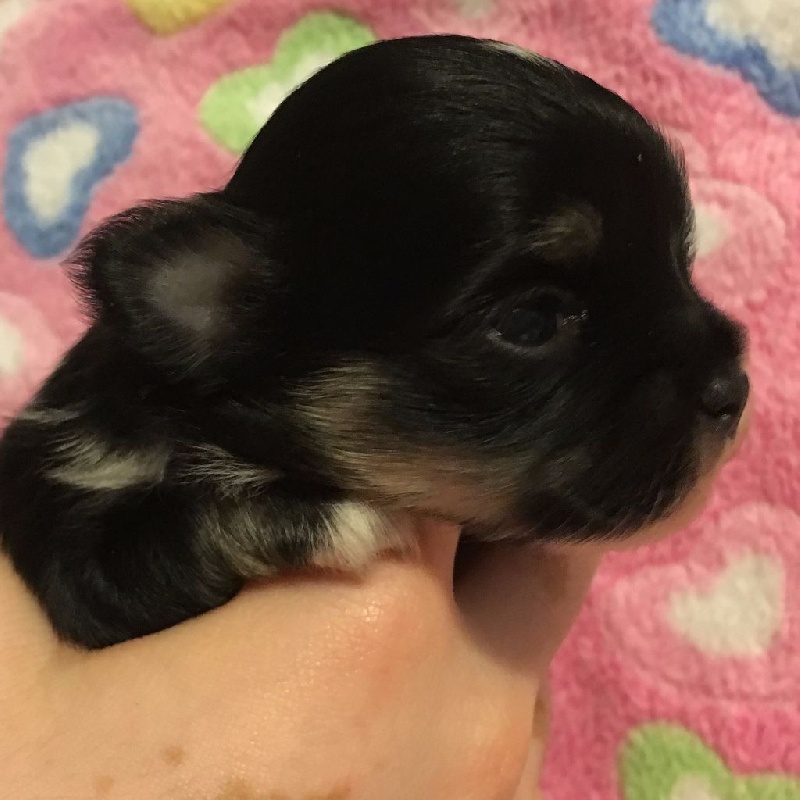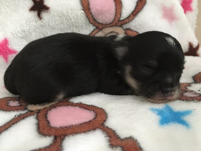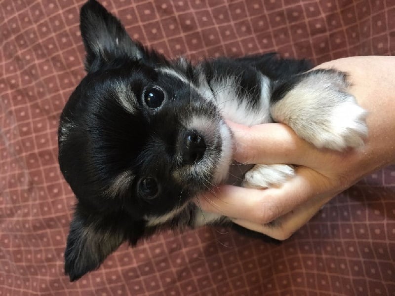 Femelle chihuahua poil long noire et blanche porteuse de Bringé .